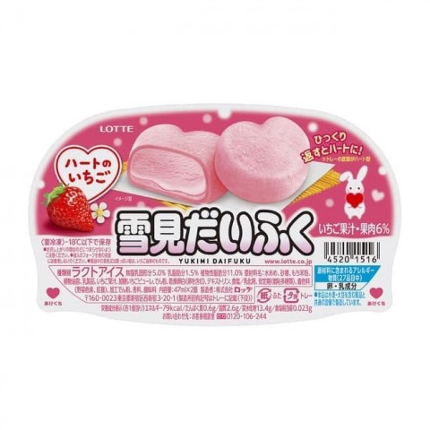 甘酸っぱい味わいのいちごアイスともちもちした食感のおもちがマッチしたハートの形の雪見だいふく。通常の丸形ではなく、丸みのあるハート形をしている。おもちの部分をピンク色にして、見た目にもかわいらしい仕立て。140円(税別) 。