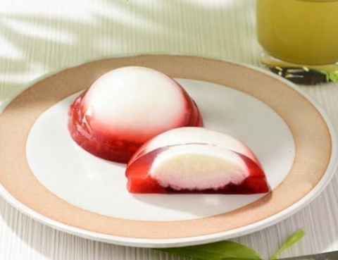 なめらかなレアチーズクリームをくず餅風ゼリーでとじこめたスイーツ。甘酸っぱい苺ゼリーがアクセントになっている。