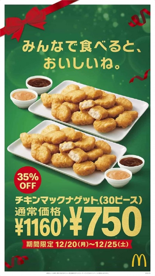 マクドナルド各店で、「チキンマックナゲット 30ピース(ソース6個付き)」が12月20~25日の6日間、35%オフの特別価格750円(通常価格1,160円)で販売される。