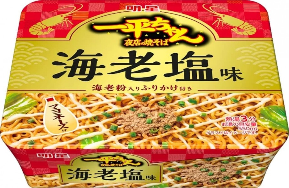「明星 一平ちゃん夜店の焼そば 海老塩味」!-- 海老の旨味と香りのソース、海老粉末入りのふりかけ、コク旨マヨで仕上げ