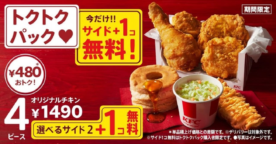KFCの定番商品「トクトクパック」にサイドメニューが1個無料でついてくる、お得なキャンペーン。お好みのサイドメニューが選べる。