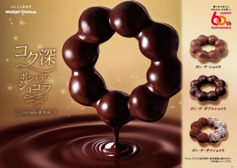 ミスタードーナツ各店で、ポン・デ・ショコラシリーズ第1弾として『コク深 ポン・デ・ショコラ』全3種が11月1日より販売される。