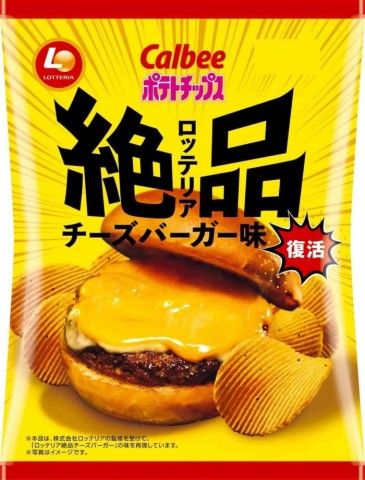 カルビーとロッテリアのコラボレーション商品「ポテトチップス ロッテリア絶品チーズバーガー味」が8月24日、全国のコンビニで発売される。10月初旬までの期間限定。200円(税込)。