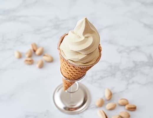 一口食べた瞬間からピスタチオの濃厚な味わいと香ばしさが広がる、数量限定のワッフルコーン。ピスタチオペーストをたっぷりと配合し、濃厚で香り高く仕上げている。