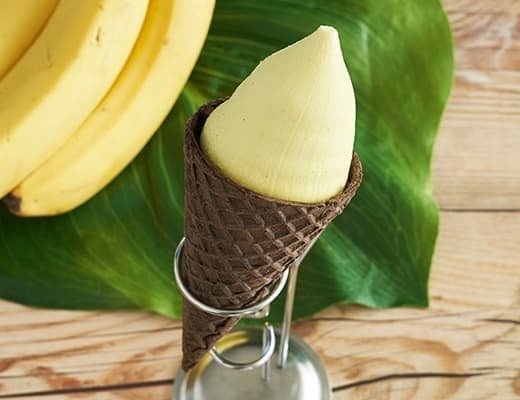 巻かない2層充填を採用したワッフルコーン。外側は酸味のあるフレッシュバナナアイス、内側はねっとり甘熟系バナナアイスで、チョコバナナの味わいを楽しめるようにチョココーンが合わされている。