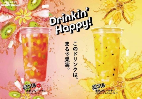 ミスタードーナツ “フルーツティ”「赤色フルーツティ ストロベリー&キウイ(通称:赤フル)」「黄色フルーツティ パイン&マンゴー&パッションフルーツ(通称:黄フル)」 (参考記事: えん食べ)