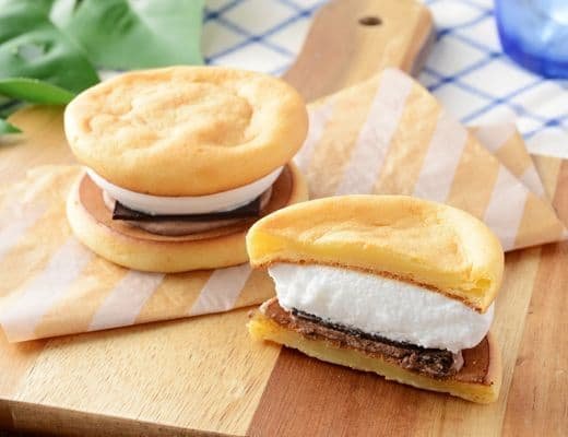 もちもちの生地で、ぷにぷに食感のマシュマロクリームとチョコクリーム、パリパリ食感の板チョコをサンド。