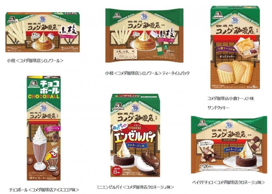 今回のコラボレーションでは、「小枝<コメダ珈琲店シロノワール>」2品、「コメダ珈琲店小倉トースト味サンドクッキー」、「チョコボール<コメダ珈琲店アイスココア味>」「ミニエンゼルパイ<コメダ珈琲店クロネージュ味>」「ベイクドチョコ<コメダ珈琲店クロネージュ味>」が発売される。