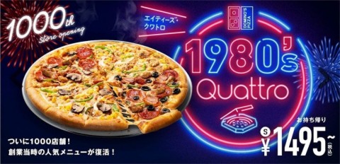 ドミノ・ピザは、10月10日オープンする「ドミノ・ピザ 江東古石場店」をもって、国内1,000店舗目の出店を達成。これを記念し、ドミノ・ピザの1985年からの創業期に、ドミノ・ピザの日本で支持されてきた、4つの大人気商品を一枚のクワトロに復活させた「1980’s・クワトロ(エイティーズ・クワトロ)」が期間限定で販売される。販売期間は10月10日から10月22日まで。