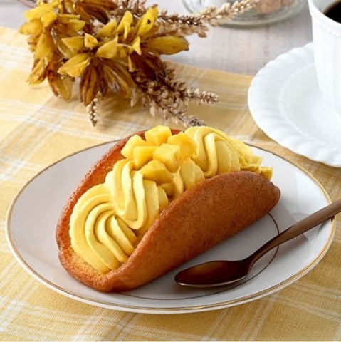 ふんわりくちどけのよいオムレット生地で、ホイップ、濃厚なさつまいもペースト、さつまいもクリームを包み、角切りのさつまいもをトッピング。