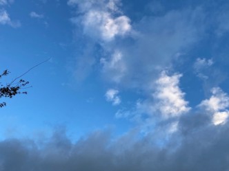 今朝はまとまった雲が多く浮かんでいるものの、その間から青空が見えて陽が射してきています。
