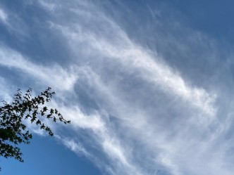 今朝は晴れて、薄い雲がかかる青空が広がっています。