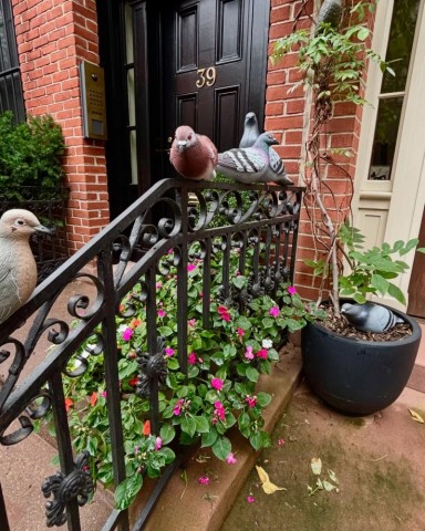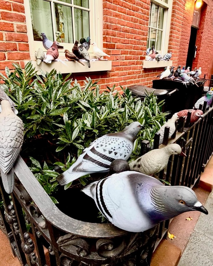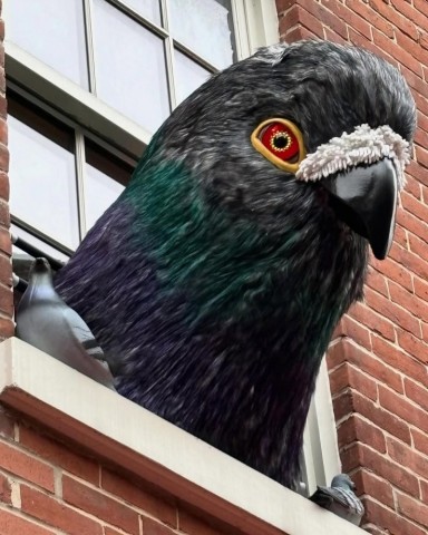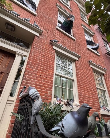 今年のハロウィンで、ニューヨーク・ウエストビレッジのタウンハウスに装飾されたハトのインスタレーションです。住宅所有者が考案し、アーティストの Carl Tallent氏と Cristian Gonzalez氏が手がけました。「鳩の侵略2025」と題されたこの作品は、最上階の窓から巨大なハトの頭と翼が飛び出している様子や、たくさんの等身大のハトが家の周りに止まって占拠している様子を表現しています。
