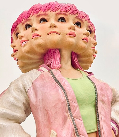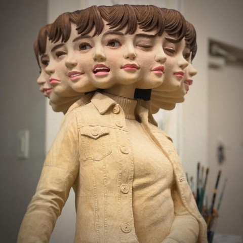 日本の彫刻家 金巻芳俊(Yoshitoshi Kanemaki)さんが制作する、多様な表情が同居する多面的な人物の木彫彫刻です。現代人が誰しも抱えるアンビバレンスな感情、複数の顔や視線が混在する人間像を通じて心情の揺れや時間を木彫で表現しています。