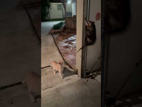 ガレージでオポッサムと出会った猫さん
