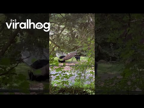 民家のハンモックでくつろぐクマの家族