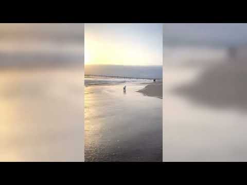 誕生日に夕暮れのビーチを駆け回るサモエド犬
