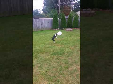 風船で遊ぶワンちゃん、上手に鼻先で上げていたのですが・・・