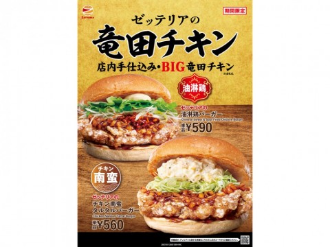 フェアでは店内手仕込みの大きな竜田チキンを使った「チキン南蛮 タルタルバーガー」と「油淋鶏バーガー」を期間限定で販売する。ちなみに3月末までにすべてのロッテリアがゼッテリアに転換される予定。