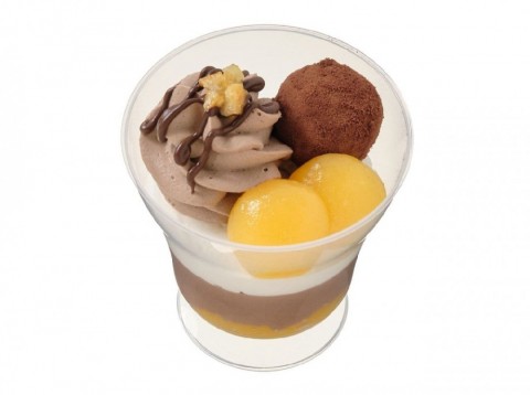 オレンジ葛ゼリー、チョコムース、ミルクムースの上にチョコ餅、オレンジわらび餅、チョコクリーム、チョコソース、オレンジピールを盛り付けたパフェ。429.84円。