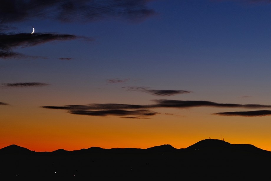 なだらかな丘陵に沈む夕日(イタリア、エウガネイの丘)