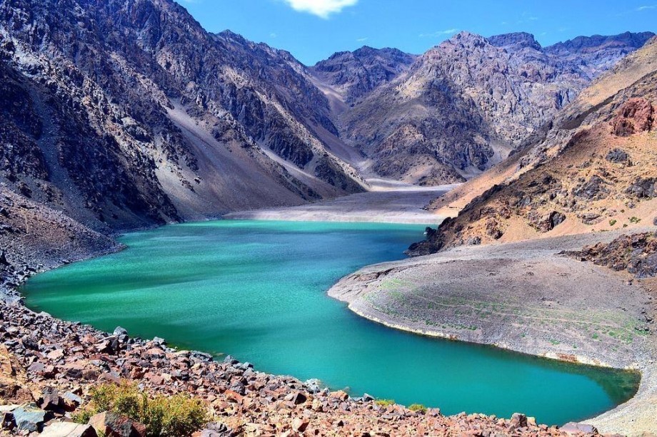 山あいにエメラルドグリーンの水をたたえる湖(モロッコ、ハイアトラス山脈、イフニ湖)