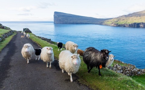 海沿いの道をみんなで歩く(羊の群れ、フェロー諸島)