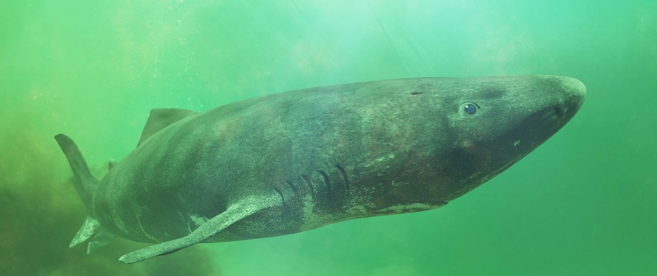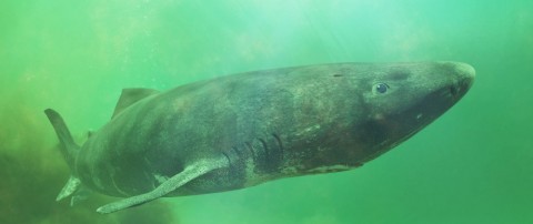 深海をゆっくりと泳ぐグリーンランド・シャーク(ニシオンデンザメ)
