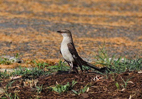 平地に立ち、辺りを見渡して(マネシツグミ)